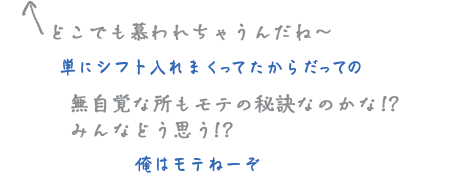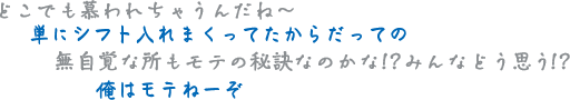 本人は自分を「器用貧乏」だと気にしているが、まとめ役や中心的立ち位置になるのは、彼のカリスマ性にもある事を自覚していない。