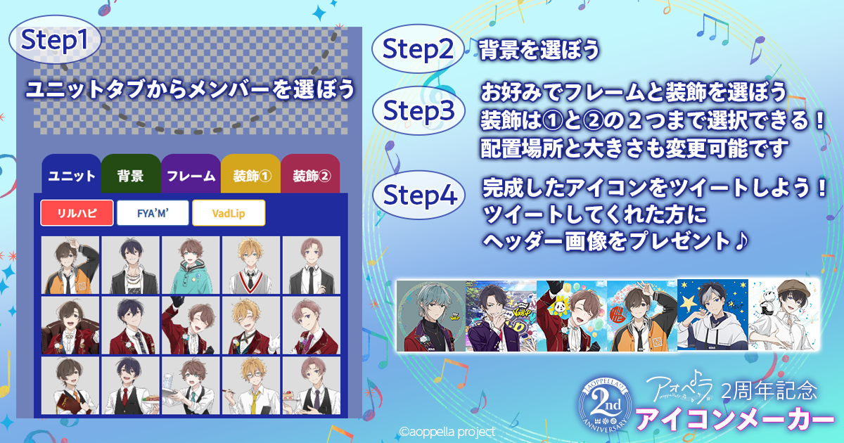 アオペラは3月4日で2周年をむかえました! あなただけのオリジナルのアイコンを作って2周年をお祝いしよう♪作ったユニットのヘッダー画像もGETできます!